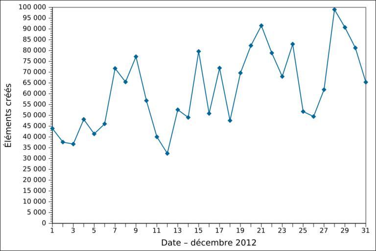 Keywords: 2012-12 Wikidata item creation FR.svg de Grafische Darstellung des täglichen Anzahls der in Dezember 2012 angelegten Gegenstände auf Wikidata auf Französisch Löschungen werden nicht berücksichtigt en Graph presenting the number of items created daily on Wikidata in December 2012 in French Item deletions are not taken into account fr Graphique en français représentant le nombre d'éléments créés par jour sur Wikidata en décembre 2012 Les suppressions d'éléments ne sont pas prises en compte 2013-01-01 16 49 00 own Ljubinka cc-zero de inline yes File 2012-12 Wikidata item creation DE svg en inline yes File 2012-12 Wikidata item creation EN svg Wikidata statistics in December 2012 Wikidata statistics in French