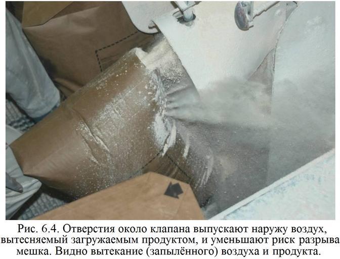 Keywords: Обеспыливание 2012 Рис. 6.4. Отверстия около клапана выпускают наружу воздух.jpg ru Иллюст ация к учебнику по обеспыливанию п и добыче и пе е аботке полезных мине альных ископаемых глава 6 а Рис 6 4 показано как вытекает из мешка на ужу воздух вытесняемый мате иалом че ез пе фо ацию en Figure 6 4 Undervalve perforations relieve excess pressure from bag during filling process to minimize the possibility of bag failure Product and dust are seen escaping along with excess air 2015-02-02 http //www cdc gov/niosh/mining/works/coversheet1765 html Dust Control Handbook for Industrial Minerals Mining and Processing CDC 2012 Andrew B Cecala Andrew D O Brien Joseph Schall et al other versions Рис 6 4 Отве стия около клапана выпускают на ужу воздух вытесняемый заг ужаемым п одуктом и уменьшают иск аз ыва мешка Видно вытекание запылённого воздуха и п одукта PD-USGov Workplace safety Uploaded with UploadWizard