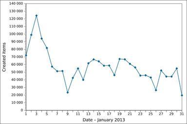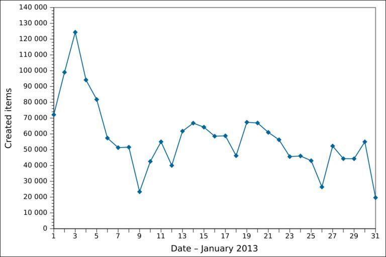 Keywords: 2013-01 Wikidata item creation EN.svg de Grafische Darstellung des täglichen Anzahls der in Januar 2013 angelegten Gegenstände auf Wikidata auf Englisch Löschungen werden nicht berücksichtigt en Graph presenting the number of items created daily on Wikidata in January 2013 in English Item deletions are not taken into account fr Graphique en anglais représentant le nombre d'éléments créés par jour sur Wikidata en janvier 2013 Les suppressions d'éléments ne sont pas prises en compte 2013-02-01 16 45 00 own Ljubinka cc-zero de inline yes File 2013-01 Wikidata item creation DE svg fr inline yes File 2013-01 Wikidata item creation FR svg Wikidata statistics in January 2013 Wikidata statistics in English