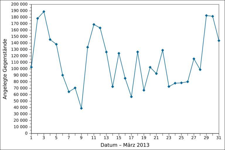 Keywords: 2013-03 Wikidata item creation DE.svg de Grafische Darstellung des täglichen Anzahls der in März 2013 angelegten Gegenstände auf Wikidata auf Deutsch Löschungen werden nicht berücksichtigt en Graph presenting the number of items created daily on Wikidata in March 2013 in German Item deletions are not taken into account fr Graphique en allemand représentant le nombre d'éléments créés par jour sur Wikidata en mars 2013 Les suppressions d'éléments ne sont pas prises en compte 2013-04-01 21 28 own Ljubinka cc-zero en inline yes File 2013-03 Wikidata item creation EN svg fr inline yes File 2013-03 Wikidata item creation FR svg Wikidata statistics in March 2013 Wikidata statistics in German