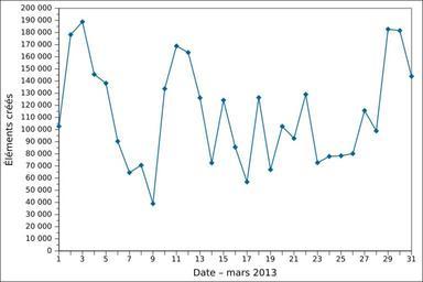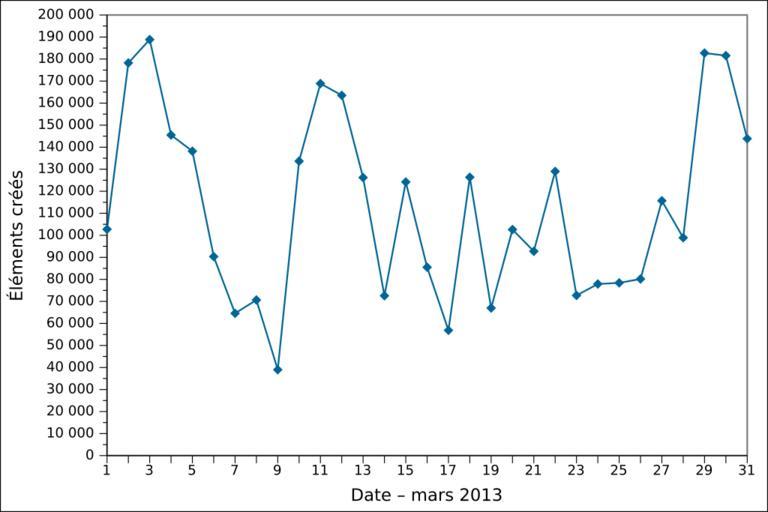 Keywords: 2013-03 Wikidata item creation FR.svg de Grafische Darstellung des täglichen Anzahls der in März 2013 angelegten Gegenstände auf Wikidata auf Französisch Löschungen werden nicht berücksichtigt en Graph presenting the number of items created daily on Wikidata in March 2013 in French Item deletions are not taken into account fr Graphique en français représentant le nombre d'éléments créés par jour sur Wikidata en mars 2013 Les suppressions d'éléments ne sont pas prises en compte 2013-04-01 21 28 own Ljubinka cc-zero File 2013-03 Wikidata item creation DE svg File 2013-03 Wikidata item creation EN svg Wikidata statistics in March 2013 Wikidata statistics in French