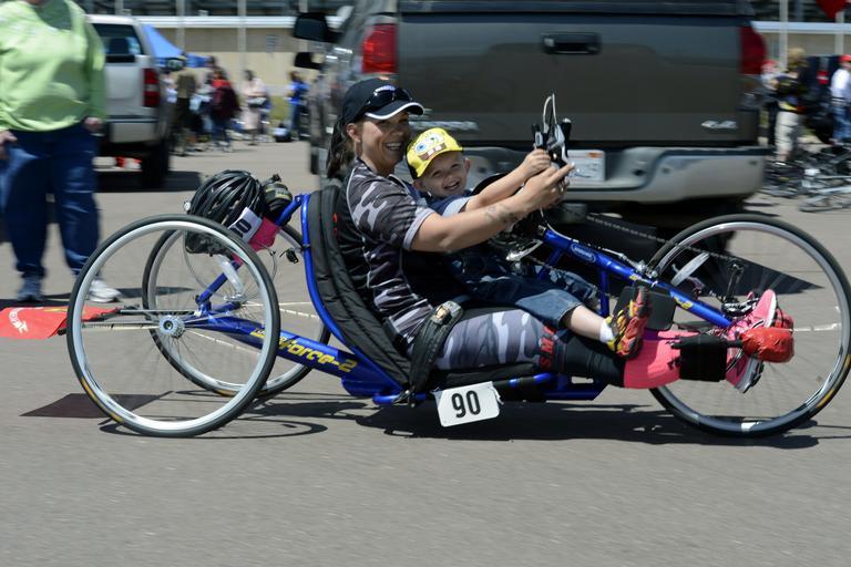 | Keywords: 2013 Warrior Games 130512-D-DB155-003.jpg en Marine Cpl Breanna Dill gives her son Landon 3 a ride on her recumbent bike before competing in the 2013 Warrior Games cycling competition near the U S Air Force Academy Stadium in Colorado Springs Colo May 12 From May 11-16 more than 200 wounded ill and injured servicemembers and veterans from the U S Marines Army Air Force and Navy as well as a team representing U S Special Operations Command and a team from the United Kingdom will compete for the gold in track and field shooting archery swimming cycling wheelchair basketball and sitting volleyball at the U S Olympic Training Center and U S Air Force Academy The military service with the most medals will win the Commander's Cup 2013-05-12 EJ Hersom https //www dvidshub net/image/929877 130512-D-DB155-003 2013-05-12 20 56 COLORADO SPRINGS CO US PD-USGov U S Olympic Training Center Images from DoD uploaded by Fæ |