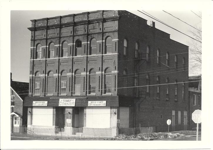 Keywords: 1980s text architecture Photograph of the former Colp Block on the southwest corner of St. George and Edmon Streets in Deseronto, Ontario. The building was torn down in the early 1980s. Signs on the first floor of the building read "Groceries Pop & Ice Cream", "Family Corner" and "Solid State Colour Servicing". Photograph of the former Colp Block on the southwest corner of St. George and Edmon Streets in Deseronto, Ontario. The building was torn down in the early 1980s. Signs on the first floor of the building read "Groceries Pop & Ice Cream", "Family Corner" and "Solid State Colour Servicing". |