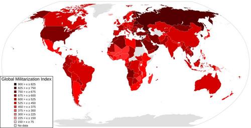 Keywords: 2014 world map of countries by Global Militarization Index.svg Editor's note This map is saved in human-editable plain text format to make updating easier for everyone Save and open with Notepad and simply cut and paste the country code from one class to another when updating then save and upload with a new file name for that year Robinson projection SVG map of world countries shaded by their Global Militarization Index for the year 2014; a measure of the weight and importance of a country's military to the society http //gmi bicc de/index php page ranking-table year 2014 BICC 2014 2015-12-04 Jolly Janner <gallery> File 2014 world map of countries by Global Militarization Index svg Global Militarization Index File 2014 world map of countries by Military Expenditure Index svg Military Expenditure Index File 2014 world map of countries by Military Personnel Index svg Military Personnel Index File 2014 world map of countries by Heavy Weapons Index svg Heavy Weapons Index </gallery> Militarization index maps of the world |
