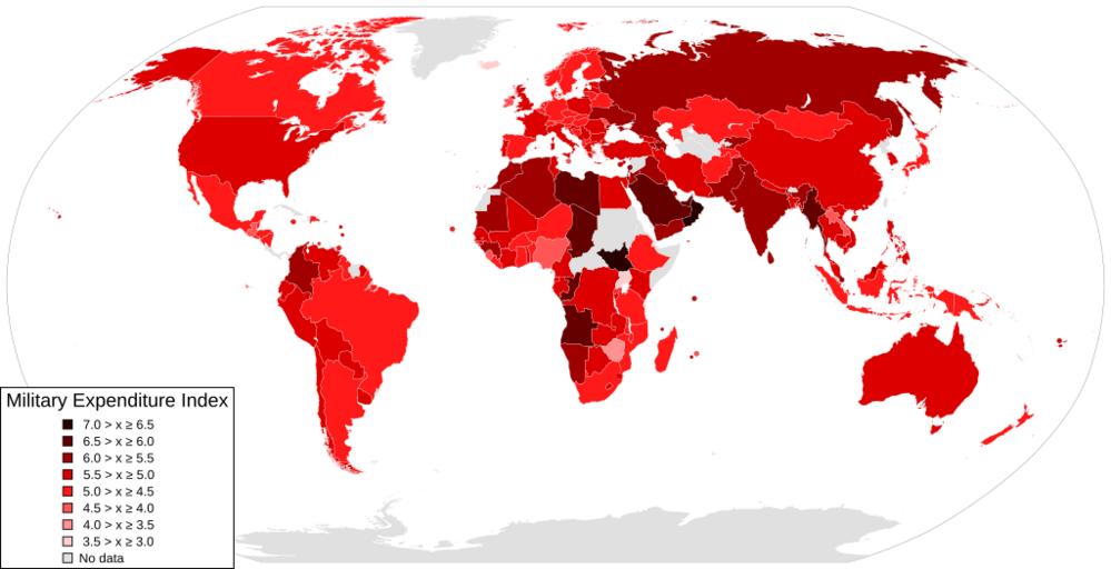 Keywords: 2014 world map of countries by Military Expenditure Index.svg Editor's note This map is saved in human-editable plain text format to make updating easier for everyone Save and open with Notepad and simply cut and paste the country code from one class to another when updating then save and upload with a new file name for that year Robinson projection SVG map of world countries shaded by their Military Expenditure Index for the year 2014; a comparison of military expenditures with GDP and health expenditure http //gmi bicc de/index php page ranking-table year 2014 BICC 2014 2015-12-04 Jolly Janner <gallery> File 2014 world map of countries by Global Militarization Index svg Global Militarization Index File 2014 world map of countries by Military Expenditure Index svg Military Expenditure Index File 2014 world map of countries by Military Personnel Index svg Military Personnel Index File 2014 world map of countries by Heavy Weapons Index svg Heavy Weapons Index </gallery> Militarization index maps of the world |