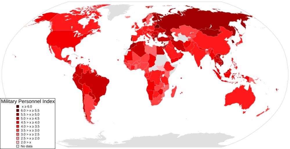 Keywords: 2014 world map of countries by Military Personnel Index.svg Editor's note This map is saved in human-editable plain text format to make updating easier for everyone Save and open with Notepad and simply cut and paste the country code from one class to another when updating then save and upload with a new file name for that year Robinson projection SVG map of world countries shaded by their Military Expenditure Index for the year 2014; a contrast between military and paramilitary personnel with population and number of physicians http //gmi bicc de/index php page ranking-table year 2014 BICC 2014 2015-12-06 Jolly Janner <gallery> File 2014 world map of countries by Global Militarization Index svg Global Militarization Index File 2014 world map of countries by Military Expenditure Index svg Military Expenditure Index File 2014 world map of countries by Military Personnel Index svg Military Personnel Index File 2014 world map of countries by Heavy Weapons Index svg Heavy Weapons Index </gallery> Militarization index maps of the world |