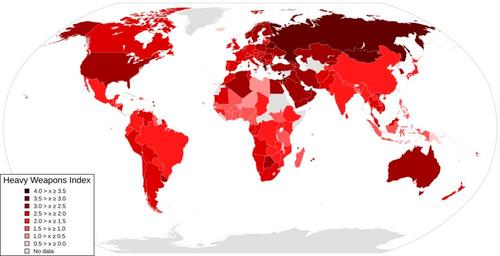 Keywords: 2014 world map of countries by Heavy Weapons Index.svg Editor's note This map is saved in human-editable plain text format to make updating easier for everyone Save and open with Notepad and simply cut and paste the country code from one class to another when updating then save and upload with a new file name for that year Robinson projection SVG map of world countries shaded by their Military Expenditure Index for the year 2014; a measure of the number of heavy weapons in relation to population http //gmi bicc de/index php page ranking-table year 2014 BICC 2014 2015-12-06 Jolly Janner <gallery> File 2014 world map of countries by Global Militarization Index svg Global Militarization Index File 2014 world map of countries by Military Expenditure Index svg Military Expenditure Index File 2014 world map of countries by Military Personnel Index svg Military Personnel Index File 2014 world map of countries by Heavy Weapons Index svg Heavy Weapons Index </gallery> Militarization index maps of the world |