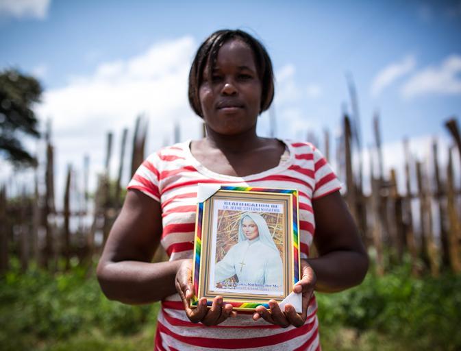 Keywords: kenya nyeri africa roman catholic italy nun sister irene stefani nyaatha mathari gikoni sainthood missionary world war one beatification ceremony soldiers wounded tourism christian nuns faith religion people outdoor KENYA, Nyeri: In a photograph taken 23 May 2015, and made available by Make It Kenya, a woman holds a framed picture of Sister Irene Stefani, an Italian nun and missionary who is beloved in Nyeri and its environs for her selfless service to wounded World War One soldiers and ailing locals alike. Thousands of Catholic faithful, clery, government officials, residents and visitors gathered in the Kenyan town of Nyeri today, 23 May, to witness Africa’s first beatification ceremony for Sister Stefani, who was known as Aurelia Jacoba Mercede until she joined the Consolata Missionary Sisters and changed her name in 1911. She arrived in Nyeri in 1915 and gained fame over the years for her genorosity and extraordinary empathy for the sick, wounded and aged. She died in 1930 at the age of 39, after contracting plague from infected patients that she insisted on treating. Catholic authorities say that reports of her kindness and a miracle attributed to her intercession, moved Pope Francis to approve preparations for her beatification in 2014. MANDATORY CREDIT: MAKE IT KENYA PHOTO / STUART PRICE. KENYA, Nyeri: In a photograph taken 23 May 2015, and made available by Make It Kenya, a woman holds a framed picture of Sister Irene Stefani, an Italian nun and missionary who is beloved in Nyeri and its environs for her selfless service to wounded World War One soldiers and ailing locals alike. Thousands of Catholic faithful, clery, government officials, residents and visitors gathered in the Kenyan town of Nyeri today, 23 May, to witness Africa’s first beatification ceremony for Sister Stefani, who was known as Aurelia Jacoba Mercede until she joined the Consolata Missionary Sisters and changed her name in 1911. She arrived in Nyeri in 1915 and gained fame over the years for her genorosity and extraordinary empathy for the sick, wounded and aged. She died in 1930 at the age of 39, after contracting plague from infected patients that she insisted on treating. Catholic authorities say that reports of her kindness and a miracle attributed to her intercession, moved Pope Francis to approve preparations for her beatification in 2014. MANDATORY CREDIT: MAKE IT KENYA PHOTO / STUART PRICE.