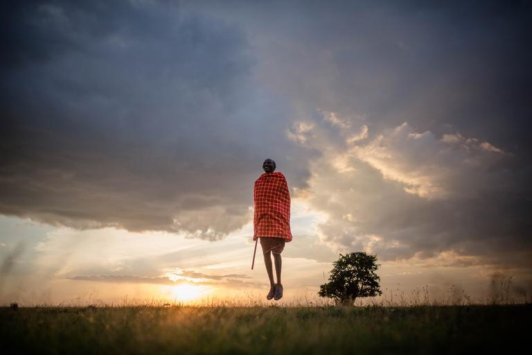 Keywords: kenya travel tourism culture tradition maasai mara national reserve north conservancy wildlife conservation walking village manyatta traditional contemporary lifestyles modern world 21st century change development outdoor sky cloud KENYA, Maasai Mara: In a photograph taken by Make It Kenya 23 June 2015, Josphat Mako, Maasai guide and companion to author and travel writer Stuart Butler sings traditional songs while jumping as the sun begins to set over the Mara North Conservancy adjacent to Kenya's world famous Maasai Mara National Reserve. Throughout the months of May and June, Stuart and Mako walked over 200km across traditional lands belonging to Kenya's Maasai. Embarking from the high, remote and forested Loita Hills they headed west, skirting the edge of the world famous Maasai Mara National Reserve, passing through private and community conservancies before finishing at the foot of the Oloololo Escarpment. During the expedition, Stuart and Mako visited numerous Maasai villages known as manyattas spending time with both past and present generations of Maasai people, learning about their traditional cultures and contemporary Maasai lifestyles, and the pressure of the modern world and the 21st Century, conservation, political pressures and tourism, all of which influence and contribute to Maasai life today. MANDATORY CREDIT: MAKE IT KENYA PHOTO / STUART PRICE. KENYA, Maasai Mara: In a photograph taken by Make It Kenya 23 June 2015, Josphat Mako, Maasai guide and companion to author and travel writer Stuart Butler sings traditional songs while jumping as the sun begins to set over the Mara North Conservancy adjacent to Kenya's world famous Maasai Mara National Reserve. Throughout the months of May and June, Stuart and Mako walked over 200km across traditional lands belonging to Kenya's Maasai. Embarking from the high, remote and forested Loita Hills they headed west, skirting the edge of the world famous Maasai Mara National Reserve, passing through private and community conservancies before finishing at the foot of the Oloololo Escarpment. During the expedition, Stuart and Mako visited numerous Maasai villages known as manyattas spending time with both past and present generations of Maasai people, learning about their traditional cultures and contemporary Maasai lifestyles, and the pressure of the modern world and the 21st Century, conservation, political pressures and tourism, all of which influence and contribute to Maasai life today. MANDATORY CREDIT: MAKE IT KENYA PHOTO / STUART PRICE.