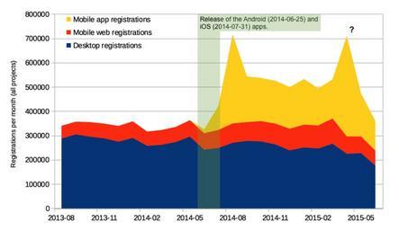 Keywords: 2015-06 Wikimedia account registrations by platform.png en A graph of monthly Wikimedia account registrations broken down by registration platform desktop mobile web or mobile app 2015-07-16 own Neil P Quinn-WMF other versions cc-zero Uploaded with UploadWizard Uncategorized 2015 September 11 |