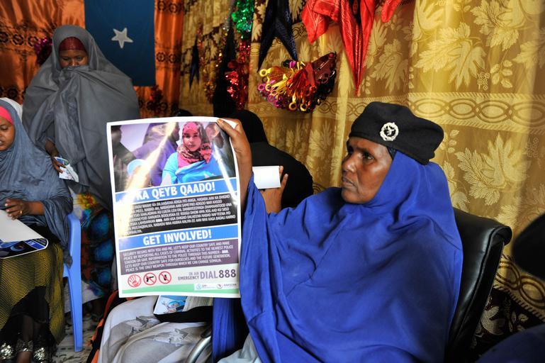 | Keywords: A female Somali police holds a community policing poster during a town hall meeting at the Shibis district headquarters jointly organised by the AMISOM Police Component, the Somalia Police Force and District Administrators in Mogadishu, Somalia, on August 6, 2015. This event was supported by the AMISOM Police component. AMISOM Photo/Omar Abdisalan A female Somali police holds a community policing poster during a town hall meeting at the Shibis district headquarters jointly organised by the AMISOM Police Component, the Somalia Police Force and District Administrators in Mogadishu, Somalia, on August 6, 2015. This event was supported by the AMISOM Police component. AMISOM Photo/Omar Abdisalan |