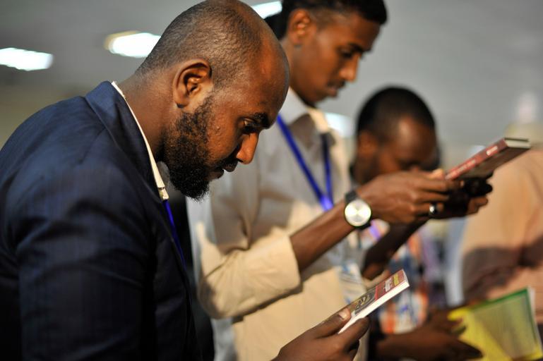 | Keywords: Reading enthusiasts check out book titles during the Mogadishu International Book Fair held in Mogadishu, Somalia on August 26 2015. Mogadishu held its first-ever book fair to celebrate books, literature and the revival of human expression in Somali Society. The fair aimed to expose the youth to international and Somali literature and grow a new generation of literate and creative individuals keen to contribute to the development of the community. AMISOM Photo / Ilyas Ahmed Reading enthusiasts check out book titles during the Mogadishu International Book Fair held in Mogadishu, Somalia on August 26 2015. Mogadishu held its first-ever book fair to celebrate books, literature and the revival of human expression in Somali Society. The fair aimed to expose the youth to international and Somali literature and grow a new generation of literate and creative individuals keen to contribute to the development of the community. AMISOM Photo / Ilyas Ahmed |