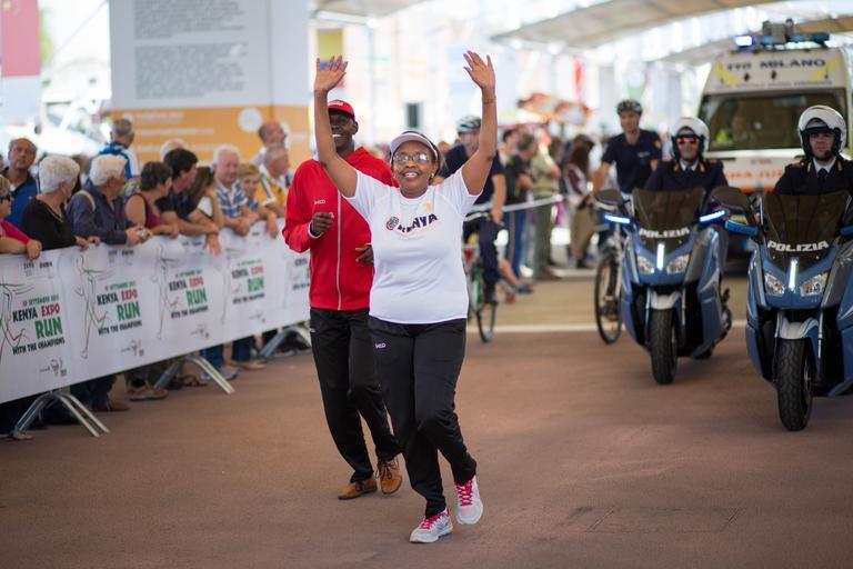Keywords: kenya italy milan expo 2015 traditional singing dancing song dance race marathon athletes runners run 3km 10km music celebration showcase world coffee nation tourism investment ITALY, Milan: In a photograph taken by Make It Kenya 10 September 2015, Hon. Phyllis Kandie, Minister for East Afrian Affairs, Commerce and Tourism (MEAACT) approaches the finish line of a 3km family fun run as part of a number of events held in Milan this week to mark the Kenyan Week celebrations at Expo Milan 2015, a universal exhibition and platform for the exchange of ideas and shared solutions on the theme of food. MANDATORY CREDIT: MAKE IT KENYA PHOTO / STUART PRICE. ITALY, Milan: In a photograph taken by Make It Kenya 10 September 2015, Hon. Phyllis Kandie, Minister for East Afrian Affairs, Commerce and Tourism (MEAACT) approaches the finish line of a 3km family fun run as part of a number of events held in Milan this week to mark the Kenyan Week celebrations at Expo Milan 2015, a universal exhibition and platform for the exchange of ideas and shared solutions on the theme of food. MANDATORY CREDIT: MAKE IT KENYA PHOTO / STUART PRICE.