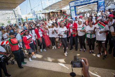Keywords: kenya italy milan expo 2015 traditional singing dancing song dance race marathon athletes runners run 3km 10km music celebration showcase world coffee nation tourism investment outdoor ITALY, Milan: In a photograph taken by Make It Kenya 10 September 2015, members of the Kenya Pavilion Expo Milan 2015 team sing and dance at the finish line of a 3km family fun run outside the Kenya Pavilion having just finished the race. Part of Kenyan Week celebrations at Expo Milan 2015, a universal exhibition and platform for the exchange of ideas and shared solutions on the theme of food, a number of events were held in Milan to mark the occasion, incluing the 3km family fun run completed by Hon. Phyllis Kandie, Minister for East Afrian Affairs, Commerce and Tourism (MEAACT) and the Kenya Expo Run With The Champions 10km race in which some of Kenyans top athletes competed against professional and enthusiast runners alike. MANDATORY CREDIT: MAKE IT KENYA PHOTO / STUART PRICE. ITALY, Milan: In a photograph taken by Make It Kenya 10 September 2015, members of the Kenya Pavilion Expo Milan 2015 team sing and dance at the finish line of a 3km family fun run outside the Kenya Pavilion having just finished the race. Part of Kenyan Week celebrations at Expo Milan 2015, a universal exhibition and platform for the exchange of ideas and shared solutions on the theme of food, a number of events were held in Milan to mark the occasion, incluing the 3km family fun run completed by Hon. Phyllis Kandie, Minister for East Afrian Affairs, Commerce and Tourism (MEAACT) and the Kenya Expo Run With The Champions 10km race in which some of Kenyans top athletes competed against professional and enthusiast runners alike. MANDATORY CREDIT: MAKE IT KENYA PHOTO / STUART PRICE. |