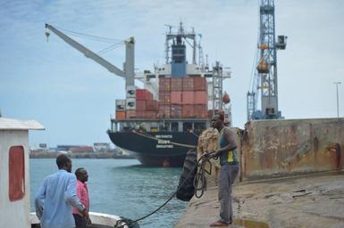 | Keywords: outdoor A Somali man helps dock a smaller boat in Mogadishu's port on September 17, 2005, while a much larger container ship gets off loaded in the background. AMISOM Photo / Tobin Jones A Somali man helps dock a smaller boat in Mogadishu's port on September 17, 2005, while a much larger container ship gets off loaded in the background. AMISOM Photo / Tobin Jones |