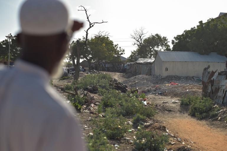 | Keywords: outdoor The loser of a former match stands next to the target, in this case a sandal that has been propped up, in order to collect the arrows which have been shot and return them to the competitors. AMISOM Photo / Tobin Jones The loser of a former match stands next to the target, in this case a sandal that has been propped up, in order to collect the arrows which have been shot and return them to the competitors. AMISOM Photo / Tobin Jones | ||||