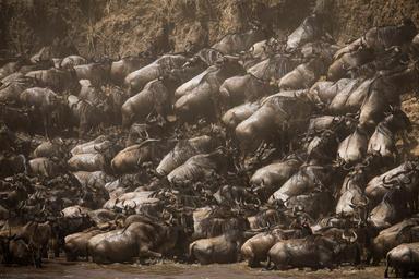 Keywords: outdoor monochrome KENYA, Masai Mara: In a photograph taken by Make It Kenya 29 September 2015, a large group of wildebeest struggle to climb the wet, sandy bank of the Mara River having swam across it in Kenya's world famous Masai Mara National Reserve. Every year, hundreds of thousands of wildebeest, zebra and other ungulate animals migrate between Tanzania's Serengeti and Kenya's Masai Mara in a year-long, continuous cycle, which sees the animals travel thousands of kilometres and is known as one of the seven natural wonders of the world, and is a major draw for wildlife enthusiasts and tourists from around the world. MANDATORY CREDIT: MAKE IT KENYA PHOTO / STUART PRICE. KENYA, Masai Mara: In a photograph taken by Make It Kenya 29 September 2015, a large group of wildebeest struggle to climb the wet, sandy bank of the Mara River having swam across it in Kenya's world famous Masai Mara National Reserve. Every year, hundreds of thousands of wildebeest, zebra and other ungulate animals migrate between Tanzania's Serengeti and Kenya's Masai Mara in a year-long, continuous cycle, which sees the animals travel thousands of kilometres and is known as one of the seven natural wonders of the world, and is a major draw for wildlife enthusiasts and tourists from around the world. MANDATORY CREDIT: MAKE IT KENYA PHOTO / STUART PRICE. |