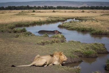 Keywords: outdoor KENYA, Masai Mara: In a photograph taken by Make It Kenya 30 September 2015, a dominant male of the Marsh Pride of lions takes a drink from a water hole, also occupied by a hippopotamus, in the early morning sunlight on the savannah of Kenya's Masai Mara National Reserve. During the months of July through to October, one of nature's greatest events takes place in the Mara when hundreds of thousands of wildebeest, zebra and other ungulates migrate northwards from Tanzania's Serengeti in search of fresh pasture and grazing, before turning and heading south again in a journey that covers thousands of kilometres and is known as one of the seven natural wonders of the world, making it a major draw for wildlife enthusiasts and tourists from around the globe. MANDATORY CREDIT: MAKE IT KENYA PHOTO / STUART PRICE. KENYA, Masai Mara: In a photograph taken by Make It Kenya 30 September 2015, a dominant male of the Marsh Pride of lions takes a drink from a water hole, also occupied by a hippopotamus, in the early morning sunlight on the savannah of Kenya's Masai Mara National Reserve. During the months of July through to October, one of nature's greatest events takes place in the Mara when hundreds of thousands of wildebeest, zebra and other ungulates migrate northwards from Tanzania's Serengeti in search of fresh pasture and grazing, before turning and heading south again in a journey that covers thousands of kilometres and is known as one of the seven natural wonders of the world, making it a major draw for wildlife enthusiasts and tourists from around the globe. MANDATORY CREDIT: MAKE IT KENYA PHOTO / STUART PRICE. |