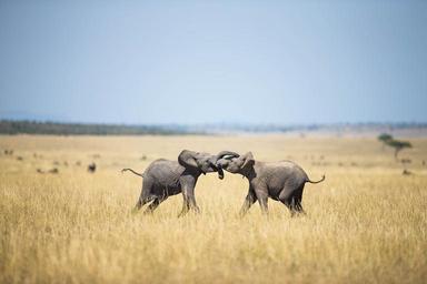 Keywords: outdoor animal landscape field KENYA, Masai Mara: In a photograph taken by Make It Kenya 03 October 2015, two young elephants spar with each other on the savannah in the Mara Triangle, part of Kenya's wider Masai Mara ecosystem. During the months of July through to October, one of nature's greatest events takes place in the Mara when hundreds of thousands of wildebeest, zebra and other ungulates migrate northwards from Tanzania's Serengeti in search of fresh pasture and grazing, before turning and heading south again in a journey that covers thousands of kilometres and is known as one of the seven natural wonders of the world, making it a major draw for wildlife enthusiasts and tourists from around the globe. MANDATORY CREDIT: MAKE IT KENYA PHOTO / STUART PRICE. KENYA, Masai Mara: In a photograph taken by Make It Kenya 03 October 2015, two young elephants spar with each other on the savannah in the Mara Triangle, part of Kenya's wider Masai Mara ecosystem. During the months of July through to October, one of nature's greatest events takes place in the Mara when hundreds of thousands of wildebeest, zebra and other ungulates migrate northwards from Tanzania's Serengeti in search of fresh pasture and grazing, before turning and heading south again in a journey that covers thousands of kilometres and is known as one of the seven natural wonders of the world, making it a major draw for wildlife enthusiasts and tourists from around the globe. MANDATORY CREDIT: MAKE IT KENYA PHOTO / STUART PRICE.
