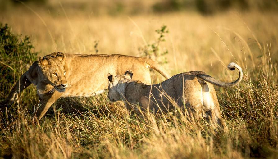 Keywords: outdoor animal field landscape depth of field serene KENYA, Masai Mara: In a photograph taken by Make It Kenya 03 October 2015, two lionesses from the Marsh Pride jostle among grass just after sunrise in the Mara Triangle, part of Kenya's wider Masai Mara ecosystem. During the months of July through to October, one of nature's greatest events takes place in the Mara when hundreds of thousands of wildebeest, zebra and other ungulates migrate northwards from Tanzania's Serengeti in search of fresh pasture and grazing, before turning and heading south again in a journey that covers thousands of kilometres and is known as one of the seven natural wonders of the world, making it a major draw for wildlife enthusiasts and tourists from around the globe. MANDATORY CREDIT: MAKE IT KENYA PHOTO / STUART PRICE. KENYA, Masai Mara: In a photograph taken by Make It Kenya 03 October 2015, two lionesses from the Marsh Pride jostle among grass just after sunrise in the Mara Triangle, part of Kenya's wider Masai Mara ecosystem. During the months of July through to October, one of nature's greatest events takes place in the Mara when hundreds of thousands of wildebeest, zebra and other ungulates migrate northwards from Tanzania's Serengeti in search of fresh pasture and grazing, before turning and heading south again in a journey that covers thousands of kilometres and is known as one of the seven natural wonders of the world, making it a major draw for wildlife enthusiasts and tourists from around the globe. MANDATORY CREDIT: MAKE IT KENYA PHOTO / STUART PRICE.