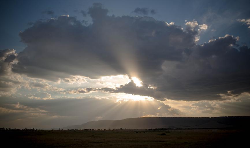Keywords: cloud sky outdoor sunset KENYA, Masai Mara: In a photograph taken by Make It Kenya 03 October 2015, shards of sunlight cascade through the cloudsabove the Oloololo Escarpment in the Mara Triangle, part of Kenya's wider Masai Mara ecosystem. During the months of July through to October, one of nature's greatest events takes place in the Mara when hundreds of thousands of wildebeest, zebra and other ungulates migrate northwards from Tanzania's Serengeti in search of fresh pasture and grazing, before turning and heading south again in a journey that covers thousands of kilometres and is known as one of the seven natural wonders of the world, making it a major draw for wildlife enthusiasts and tourists from around the globe. MANDATORY CREDIT: MAKE IT KENYA PHOTO / STUART PRICE. KENYA, Masai Mara: In a photograph taken by Make It Kenya 03 October 2015, shards of sunlight cascade through the cloudsabove the Oloololo Escarpment in the Mara Triangle, part of Kenya's wider Masai Mara ecosystem. During the months of July through to October, one of nature's greatest events takes place in the Mara when hundreds of thousands of wildebeest, zebra and other ungulates migrate northwards from Tanzania's Serengeti in search of fresh pasture and grazing, before turning and heading south again in a journey that covers thousands of kilometres and is known as one of the seven natural wonders of the world, making it a major draw for wildlife enthusiasts and tourists from around the globe. MANDATORY CREDIT: MAKE IT KENYA PHOTO / STUART PRICE.