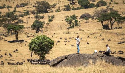 | Keywords: outdoor KENYA, Masai Mara: In a photograph taken by Make It Kenya 04 October 2015, Carel Verhoef (left) and Andre Van Kets, co-founders of HerdTracker, prepare for a live broadcast on the Twitter application Periscope below the Oloololo Escarpment in the Mara Triangle, part of Kenya's wider Masai Mara ecosystem. During the months of July through to October, one of nature's greatest events takes place in the Mara when hundreds of thousands of wildebeest, zebra and other ungulates migrate northwards from Tanzania's Serengeti in search of fresh pasture and grazing, before turning and heading south again in a journey that covers thousands of kilometres and is known as one of the seven natural wonders of the world, making it a major draw for wildlife enthusiasts and tourists from around the globe. MANDATORY CREDIT: MAKE IT KENYA PHOTO / STUART PRICE. KENYA, Masai Mara: In a photograph taken by Make It Kenya 04 October 2015, Carel Verhoef (left) and Andre Van Kets, co-founders of HerdTracker, prepare for a live broadcast on the Twitter application Periscope below the Oloololo Escarpment in the Mara Triangle, part of Kenya's wider Masai Mara ecosystem. During the months of July through to October, one of nature's greatest events takes place in the Mara when hundreds of thousands of wildebeest, zebra and other ungulates migrate northwards from Tanzania's Serengeti in search of fresh pasture and grazing, before turning and heading south again in a journey that covers thousands of kilometres and is known as one of the seven natural wonders of the world, making it a major draw for wildlife enthusiasts and tourists from around the globe. MANDATORY CREDIT: MAKE IT KENYA PHOTO / STUART PRICE. |