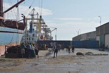 Keywords: outdoor Cattle herders help to load up a holding pen with cattle, before it is lifted onto a cargo ship by a crane in Mogadishu, Somalia, on October 29. The ship, with its load of cattle, is destined for the port of Muscat in Oman. AMISOM Photo / Tobin Jones Cattle herders help to load up a holding pen with cattle, before it is lifted onto a cargo ship by a crane in Mogadishu, Somalia, on October 29. The ship, with its load of cattle, is destined for the port of Muscat in Oman. AMISOM Photo / Tobin Jones |
