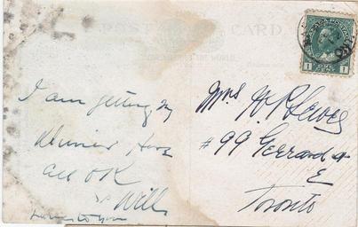 Keywords: 1910s correspondence text writing document drawing sketch Back of postcard 2015.25 (1a). It was mailed in February 1912 in Napanee to Mrs W. Clewes of 99 Gerrard Street, Toronto. The message reads: "I am getting my Dinner Here, all OK, Will, Love to you". Donated to Deseronto Archives by Mary-Anne Gibson, August 2015. Back of postcard 2015.25 (1a). It was mailed in February 1912 in Napanee to Mrs W. Clewes of 99 Gerrard Street, Toronto. The message reads: "I am getting my Dinner Here, all OK, Will, Love to you". Donated to Deseronto Archives by Mary-Anne Gibson, August 2015. |