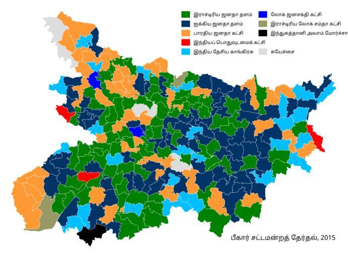 Keywords: 2015 Bihar election result (Tamil).svg en A map showing the results of the Bihar Legislative Assembly election 2015 in Tamil 2015-11-10 own Nirinsanity other versions cc-zero Election maps of Bihar Uploaded with UploadWizard