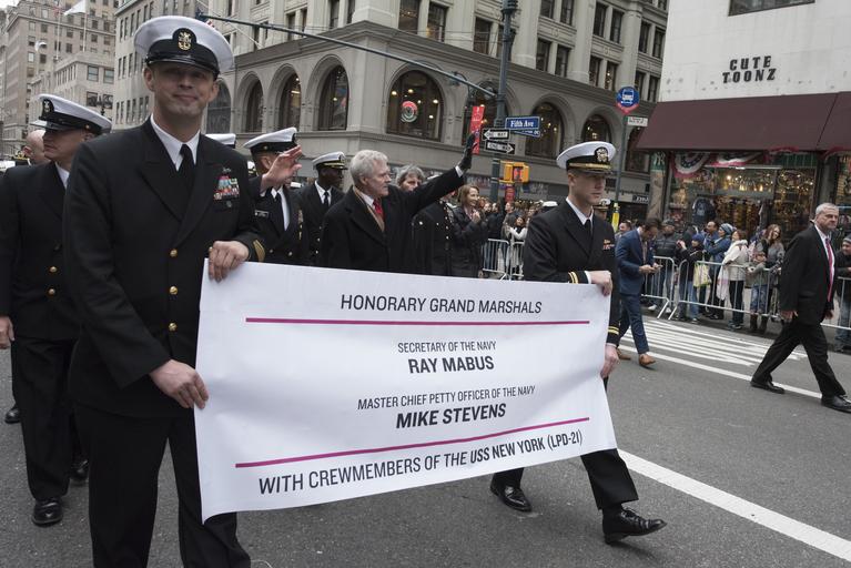 | Keywords: 2015 Veterans Day parade 151111-N-LV331-002.jpg en 151111-N-LV331-002 NEW YORK Nov 11 2015 Honorary grand marshals of the 2015 Veterans Day parade Secretary of the Navy SECNAV Ray Mabus and Master Chief Petty Officer of the Navy MCPON Mike Stevens wave to New Yorkers as they march with Sailors down 5th Avenue Mabus and the crew of USS New York LPD 21 joined more than 400 local Sailors in marching down 5th avenue to represent the U S Navy as the featured service for this year's parade U S Navy photo by Mass Communication Specialist 2nd Class Armando Gonzales/Released Unit Navy Media Content Services DVIDS Tags Secretary of the Navy; Ray Mabus; power; travel; budget; presence; partnerships; spending; Navy; people; government; SECNAV; Marine Corps; NMCS; DVIDS Bulk Import 2015-11-11 Armando Gonzales https //www dvidshub net/image/2293084/2015-veterans-day-parade 151111-N-LV331-002 2015-11-18 00 21 NEW YORK NY US PD-USGov-Military-Navy Ray Mabus Veterans Day 2015 USS New York LPD-21 Images from DoD uploaded by Fæ |