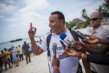 Keywords: outdoor KENYA, Watamu: In a photograph taken by Make It Kenya 17 January 2016, Kenya's Cabinet Secretary for Tourism Hon. Najib Balala gestures while speaking to the media following his arrival in the coastal town of Watamu by parachute after skydiving out of a plane from approx. 11,000ft. Kenya's famous wildlife and beautiful tropical coastline is being showcased in a series of live web broadcasts using state-of–the-art technology. #KenyaLive has enabled people to witness the excitement of a night safari in the Mara in real time using specialist night-vision equipment and is now in Watamu highlighting the work of the turtle conservation organisation Local Ocean Trust, and other activities including stand-up paddle boarding with dolphins, snorkelling and scuba diving by using the scial media application Periscope. MAKE IT KENYA PHOTO / STUART PRICE. KENYA, Watamu: In a photograph taken by Make It Kenya 17 January 2016, Kenya's Cabinet Secretary for Tourism Hon. Najib Balala gestures while speaking to the media following his arrival in the coastal town of Watamu by parachute after skydiving out of a plane from approx. 11,000ft. Kenya's famous wildlife and beautiful tropical coastline is being showcased in a series of live web broadcasts using state-of–the-art technology. #KenyaLive has enabled people to witness the excitement of a night safari in the Mara in real time using specialist night-vision equipment and is now in Watamu highlighting the work of the turtle conservation organisation Local Ocean Trust, and other activities including stand-up paddle boarding with dolphins, snorkelling and scuba diving by using the scial media application Periscope. MAKE IT KENYA PHOTO / STUART PRICE. |