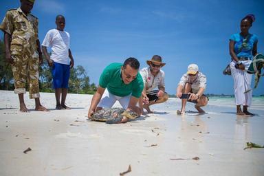 Keywords: outdoor KENYA, Watamu: In a photograph taken by Make It Kenya 17 January 2016, Kenya's Cabinet Secretary for Tourism Hon. Najib Balala (in green shirt) releases a Hawksbill turtle back into the Indian Ocean, which had been rehabilitated by the Local Ocean Trust. Balala arrived in the coastal town of Watamu by parachute this morning after skydiving out of a plane from approx. 11,000ft. Kenya's famous wildlife and beautiful tropical coastline is being showcased in a series of live web broadcasts using state-of–the-art technology. #KenyaLive has enabled people to witness the excitement of a night safari in the Mara in real time using specialist night-vision equipment and is now in Watamu highlighting the work of the turtle conservation organisation Local Ocean Trust, and other activities including stand-up paddle boarding with dolphins, snorkelling and scuba diving by using the scial media application Periscope. MAKE IT KENYA PHOTO / STUART PRICE. KENYA, Watamu: In a photograph taken by Make It Kenya 17 January 2016, Kenya's Cabinet Secretary for Tourism Hon. Najib Balala (in green shirt) releases a Hawksbill turtle back into the Indian Ocean, which had been rehabilitated by the Local Ocean Trust. Balala arrived in the coastal town of Watamu by parachute this morning after skydiving out of a plane from approx. 11,000ft. Kenya's famous wildlife and beautiful tropical coastline is being showcased in a series of live web broadcasts using state-of–the-art technology. #KenyaLive has enabled people to witness the excitement of a night safari in the Mara in real time using specialist night-vision equipment and is now in Watamu highlighting the work of the turtle conservation organisation Local Ocean Trust, and other activities including stand-up paddle boarding with dolphins, snorkelling and scuba diving by using the scial media application Periscope. MAKE IT KENYA PHOTO / STUART PRICE. |