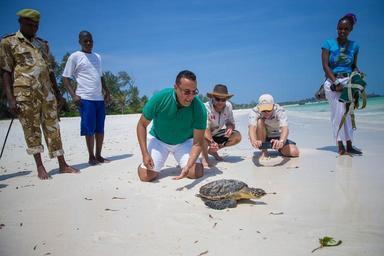 Keywords: outdoor KENYA, Watamu: In a photograph taken by Make It Kenya 17 January 2016, Kenya's Cabinet Secretary for Tourism Hon. Najib Balala (in green shirt) releases a Hawksbill turtle back into the Indian Ocean, which had been rehabilitated by the Local Ocean Trust. Balala arrived in the coastal town of Watamu by parachute this morning after skydiving out of a plane from approx. 11,000ft. Kenya's famous wildlife and beautiful tropical coastline is being showcased in a series of live web broadcasts using state-of–the-art technology. #KenyaLive has enabled people to witness the excitement of a night safari in the Mara in real time using specialist night-vision equipment and is now in Watamu highlighting the work of the turtle conservation organisation Local Ocean Trust, and other activities including stand-up paddle boarding with dolphins, snorkelling and scuba diving by using the scial media application Periscope. MAKE IT KENYA PHOTO / STUART PRICE. KENYA, Watamu: In a photograph taken by Make It Kenya 17 January 2016, Kenya's Cabinet Secretary for Tourism Hon. Najib Balala (in green shirt) releases a Hawksbill turtle back into the Indian Ocean, which had been rehabilitated by the Local Ocean Trust. Balala arrived in the coastal town of Watamu by parachute this morning after skydiving out of a plane from approx. 11,000ft. Kenya's famous wildlife and beautiful tropical coastline is being showcased in a series of live web broadcasts using state-of–the-art technology. #KenyaLive has enabled people to witness the excitement of a night safari in the Mara in real time using specialist night-vision equipment and is now in Watamu highlighting the work of the turtle conservation organisation Local Ocean Trust, and other activities including stand-up paddle boarding with dolphins, snorkelling and scuba diving by using the scial media application Periscope. MAKE IT KENYA PHOTO / STUART PRICE. |