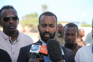 Keywords: unsom_kismayo_somalia_ddr_ground_breaking_ceremony_in_kismayo__2 unsomkismayosomaliaddrgroundbreakingceremonyinkismayo2 unsom_kismayo_somalia_ddr_ground_breaking_ceremony_in_kismayo__2016-06-13 unsomkismayosomaliaddrgroundbreakingceremonyinkismayo20160613 groupshot people outdoor Mr Malik Abdalla, the Director of Disengaged Combatants in the Ministry of Internal Security of the Federal Government of Somalia speaks to journalists during a ground breaking ceremony for the construction of Disarmament, Demobilisation and Reintegration (DDR) centre in Kismayo on June 13, 2016. UN Photo / Barut Mohamed Mr Malik Abdalla, the Director of Disengaged Combatants in the Ministry of Internal Security of the Federal Government of Somalia speaks to journalists during a ground breaking ceremony for the construction of Disarmament, Demobilisation and Reintegration (DDR) centre in Kismayo on June 13, 2016. UN Photo / Barut Mohamed |