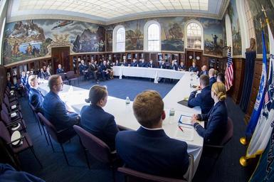 | Keywords: corps of cadets corpsofcadets u.s. coast guard academy uscoastguardacademy new london newlondon connecticut cadets officers academy brahm petty officer 2nd class richard brahm pettyofficer2ndclassrichardbrahm rear adm. james rendon rearadmjamesrendon u.s.a. usa NEW LONDON, Conn - Retired Air Force Lt. Gen. James Clapper, current director of National Intelligence, spoke to the Corp of Cadets, March 23, 2016, as the 2016 Hedrick Fellow. Clapper served as director of the Defense Intelligence Agency from 1992 until 1995, was the first Director of Defense Intelligence within the Office of the Director of National Intelligence and simultaneously the Under Secretary of Defense for Intelligence, was the director of the National Geospatial-Intelligence Agency from September 2001 until June 2006, and on June 5, 2010, President Barack Obama nominated Clapper to replace Dennis C. Blair as U.S. Director of National Intelligence. Clapper was unanimously confirmed by the Senate for the position on August 5, 2010. Official U.S. Coast Guard photos by Petty Officer 2nd Class Richard Brahm. NEW LONDON, Conn - Retired Air Force Lt. Gen. James Clapper, current director of National Intelligence, spoke to the Corp of Cadets, March 23, 2016, as the 2016 Hedrick Fellow. Clapper served as director of the Defense Intelligence Agency from 1992 until 1995, was the first Director of Defense Intelligence within the Office of the Director of National Intelligence and simultaneously the Under Secretary of Defense for Intelligence, was the director of the National Geospatial-Intelligence Agency from September 2001 until June 2006, and on June 5, 2010, President Barack Obama nominated Clapper to replace Dennis C. Blair as U.S. Director of National Intelligence. Clapper was unanimously confirmed by the Senate for the position on August 5, 2010. Official U.S. Coast Guard photos by Petty Officer 2nd Class Richard Brahm. |