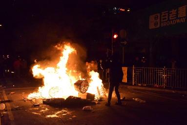 Keywords: 2016 Mong Kok civil unrest fire Barrier 2.jpg zh 示威 旺角街頭縱火 http //www voacantonese com/content/hk-lunar-new-year-fish-ball-protests-clash-with-police-live-qand-a-20160209/3183142 html Iris Tong 2016-02-09 PD-USGov-VOA 2016 Mong Kok civil unrest |