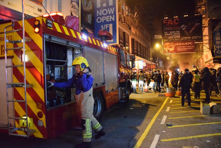 Keywords: 2016 Mong Kok civil unrest fireman.jpg zh 消防員到場撲救火焰 http //www voacantonese com/content/hk-lunar-new-year-fish-ball-protests-clash-with-police-live-qand-a-20160209/3183142 html Iris Tong 2016-02-09 PD-USGov-VOA 2016 Mong Kok civil unrest Fire engines of Hong Kong |