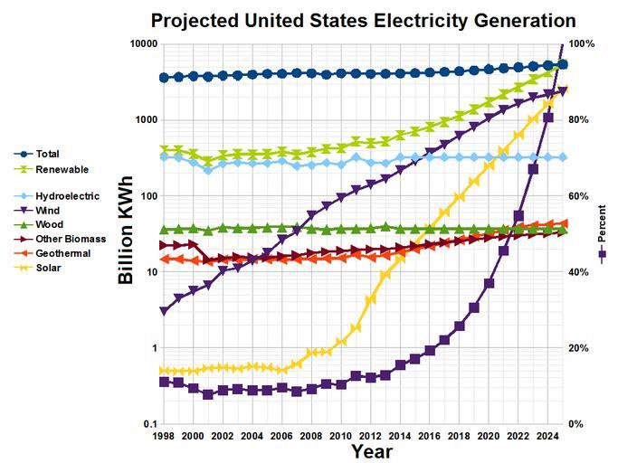Keywords: 2025 Projected United States Electricity Generation.png en Projected electricity generation in the United States based on 1 annual growth in demand 10 growth in geothermal 30 annual growth in wind power and 60 annual growth in solar power Total renewable generation is projected to reach 100 by 2025 The rate of increase of solar has been increasing by 10 each year and if that trend continues the amount of solar generation will exceed wind by 2019 and 100 of electricity will be from renewable sources by 2020 with 28 from wind power and 69 from solar power 2012-07-26 own Delphi234 Compare with File AEO 2015 Growth Projection for US Wind and Solar png the official US DOE projection which does not foresee any significant contribution from wind power or solar power through 2040 cc-zero Uploaded with UploadWizard Electricity production trends Electricity in the United States |