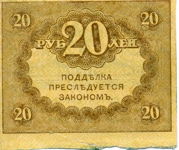 | Keywords: 20-rouble note of Russia 1919 - front.jpg 'Kerenki' of Soviet Russia 20 roubles Back « ru Ке енки» Советской России 20 ублей Об атная сто она Self-made scan of own note Scanned on 2009 printed in 1919 Scanned by Boud printed by Soviet Russia <gallery>File 20 ублей Ке енки 1917 Б jpg</gallery> PD-RU-exempt banknotes PD-old Banknotes of the Soviet Russia 1919 Banknotes with a face value of 20 | ||||