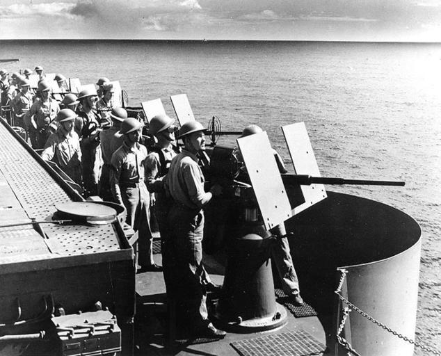 Keywords: 20mm battery with Marines on USS Yorktown (CV-5).jpg U S Marines man forward port side 20mm gun battery aboard the aircraft carrier USS Yorktown CV-5 circa Spring 1942 the camera is looking aft Note the details of gun mountings and shields rubber non-skid mats on deck and splinter protection on the outboard side of the gun gallery Aircraft arresting gear is visible on the flight deck at left <br>As a result of combat experience 20mm gun shields were later modified with angled cut-outs on the inside top of each plate providing the gunner with better vision to each side of the aiming point 20mm guns were fitted when the ship was at Norfolk Navy Yard in December 1941 Those in this gun gallery were jettisoned during salvage efforts on 6 June 1942 <br>When Yorktown´s wreck was examined in May 1998 this area was observed in detail and all the guns and mountings seen here were missing as were the middle segments of each gun position's splinter protection plating Text NHC Official U S Navy photograph http //www history navy mil/photos/images/g20000/g21929c htm 80-G-21929 spring 1942 USN PD-USGov-Military-Navy Aboard USS Yorktown CV-5 Oerlikon 20mm |