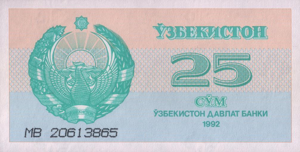 | Keywords: 25 som. Uzbekistan, 1992 a.jpg  25 сум Узбекистана 1992 25 sum of Uzbekistan 1992 own scan 1992 Central Bank of the Republic of Uzbekistan Цент альный банк Республики Узбекистан Ўзбекистон Республикаси  а казий банки PD-UZ-exempt banknotes  Banknotes of Uzbekistan 1992 Banknotes with a face value of 25 Coats of arms of Uzbekistan on banknotes |