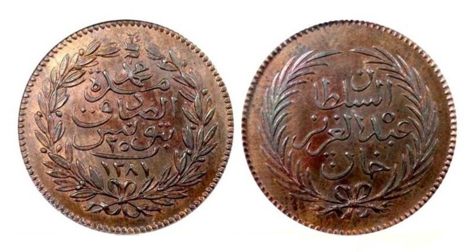 Keywords: 25 Tunisian Rial - 1281 AH.jpg en 25 Tunisian Rial coin Copper struck in Tunis in 1281 AH 1864 AD during the reign of Muhammad III as-Sadiq Bey own DrFO Jr Tn 2010 Tunisian rial coins