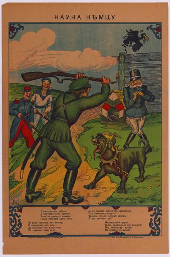 | Keywords: 26 Sammlung Eybl Russland. Anonym. Наука Немцу (Dem Deutschen eine Lehre). Ohne Jahr (wahrscheinlich 1914). 61 x 41 cm. (Slg.Nr. 41a).jpg Russland Anonym аука емцу Dem Deutschen eine Lehre Ohne Jahr wahrscheinlich 1914 61 x 41 cm Slg Nr 41a Propagandaplakat im typischen Lubok-Stil Ein russischer Soldat prügelt einen Kettenhund mit den Gesichtszügen des Deutschen Kaisers Wilhelms II Der österreichische Kaiser Franz Josef steht schlotternd vor Angst im Hintergrund Brite und Franzose sehen lachend zu Sammlung Eybl Plakatmuseum Wien 2015-09-17 10 28 30 A Erhardt Credit line Eybl Plakatmuseum Wien/Wikimedia Commons CC-BY-SA-4 0 wiki Sammlung Eybl Plakatmuseum Wien PD-old World War I posters of Russia Plakatmuseum Wien Eybl Collection |