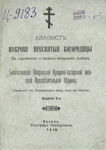 | Keywords: 2. Обложка =Акафиста Покрову Пресвятыя Богородицы=.jpg ru Обложка «Акафиста Пок ову П есвятыя Бого одицы а славянском и к ещёно-тата ском языках» Казань 1910 г Скани овано из Акафист Пок ову П есвятыя Бого одицы а славянском и к ещёно-тата ском языках Благословение Пок овской К ещёно-тата ской женской П осветительной Общины Казанской губ амадышского уезда почт отд ы ты // Издание 2-е Казань Типог афия Униве ситета 1910 Обложка Скани овано из Акафист Пок ову П есвятыя Бого одицы а славянском и к ещёно-тата ском языках Благословение Пок овской К ещёно-тата ской женской П осветительной Общины Казанской губ амадышского уезда почт отд ы ты // Издание 2-е Казань Типог афия Униве ситета 1910 Обложка Обложка 1910 г изоб ажение скани овано 6 нояб я 2012 г PD-old Religion in the Russian Empire Published in Kazan |