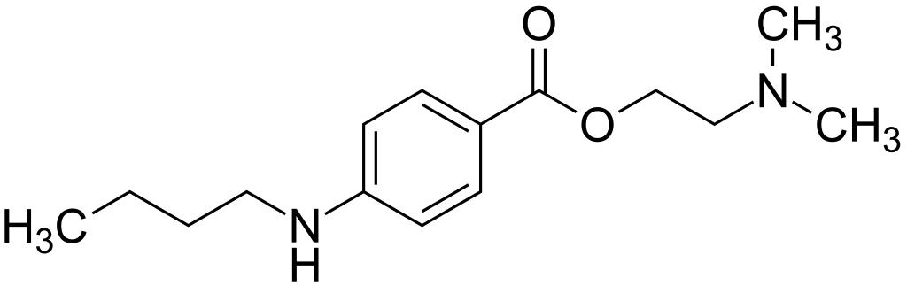 | Keywords: 2-(dimethylamino)ethyl 4-(butylamino)benzoate 200.svg validSVG Structure of 2- dimethylamino ethyl 4- butylamino benzoate Own 2014-05-29 Emeldir <span class signature-talk ></span> Chemical structure verified https //upload wikimedia org/wikipedia/commons/d/d9/2- 28dimethylamino 29ethyl_4- 28butylamino 29benzoate_200 svg 1S/C15H24N2O2/c1-4-5-10-16-14-8-6-13 7-9-14 15 18 19-12-11-17 2 3/h6-9 16H 4-5 10-12H2 1-3H3 GKCBAIGFKIBETG-UHFFFAOYSA-N 94-24-6 Synonyms <small>2- Dimethylamino ethyl 4- butylamino benzoate 2- Dimethylamino ethyl 4- n-butylamino benzoate 2- Dimethylamino ethyl p- butylamino benzoate 2-Dimethylaminoethyl 4-butylaminobenzoate 2-dimethylaminoethyl 4-butylaminobenzoate hydrochloride 4- n-Butylamino benzoic acid 2- dimethylamino ethyl ester 4-14-00-01172 Beilstein Handbook Reference Amethocaine Anetain BRN 2216051 Cetacaine Contralgin Dicain Dikain Fissucain Intercain Laudocaine Medicaine Medihaler-Tetracaine Meethobalm Metraspray Mucaesthin Niphanoid Pontocain Pontocaine Rexocaine Tetracaina Tetracaine Tetracaine Base Tetracaine Base 98 Tetracaine free base Tetracainum TetracaĆna Tetrakaiini Tetrakain Uromucaesthin</small> PD-chem Tetracaine |