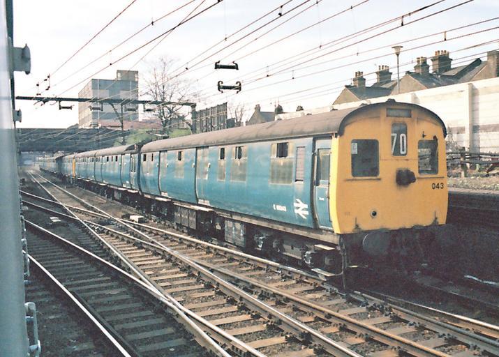 Keywords: 306 modified roofline.jpg View of the former Motor Brake Second Open MBSO vehicle showing the modified raised roofline above the cab when the pantograph was relocated to the centre carriage own SP Smiler British Rail Class 306s of British Rail 306043 British Rail Class 306s in British Rail blue livery 306043 UK trains with unidentified locations |