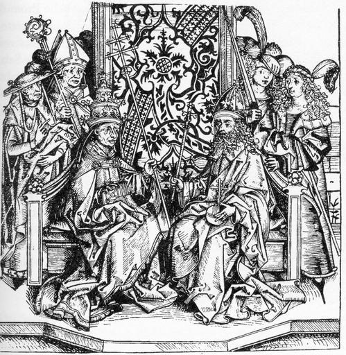 | Keywords: 307Schedelsche Chronik Papst Pius II und Kaiser Friedrich III.jpg Papst Pius II Aeneas Silvius Piccolomini und Kaiser Friedrich III <br>Schedelsche Weltchronik Wien Bildarchiv der Österreichischen Nationalbibliothek Cod 7892 fol 24 eingescannt aus Alois Niederstätter 1400 - 1522 das Jahrhundert der Mitte an der Wende vom Mittelalter zur Neuzeit aus der Reihe Österreichische Geschichte Wien 1996 ISBN 3-8000-3532-4 1493 author Reproduction of a painting that is in the public domain because of its age PD-old-100 Frederick III Holy Roman Emperor Pius II 1493 15th-century woodcuts |