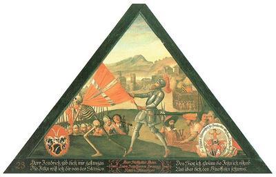 Keywords: 30 Der Faehnrich.jpg de Spreuerbrücke Tafel 30 Der Faehnrich<br /> Herr Fendrich gib dich mir gefangen<br /> die Fahn reiss ich dir von den Stangen<br /> Den Sieg ich g'wünn die Fahn ich nihmb<br /> Und über dich den Bluotfahn schwing 1626 1635 Katalog der Brückenbilder von Heinz Horat Aus dem Buch Die Spreuerbrücke in Luzern Ein barocker Totentanz von europäischer Bedeutung Raeber Verlag Luzern 1996 Kaspar Meglinger 1595-1670 other versions PD-old-100-1923 Paintings of the Spreuerbrucke Lucerne in art Kaspar Meglinger Uploaded with UploadWizard |