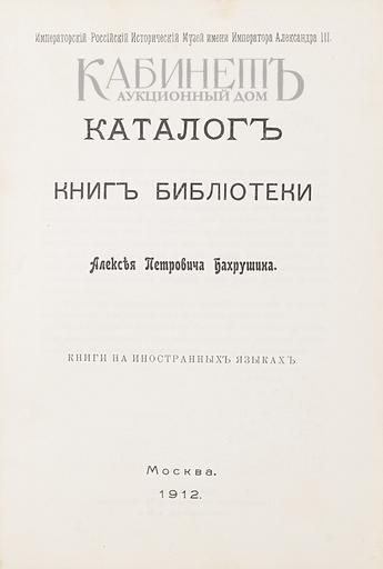 Keywords: Архив аукциона №15(55) Лот 246 Каталог книг библиотеки Алексея Петровича Бахрушина. Выпуск I. Выпуск II. Выпуск дополнительный - Книги на иностранных языках. М., Типо-Литография Торгового Дома А.П. Коркин, 1911-1912. Формат издания: 27 х 18 см. Выпуск I – [1], 1 портрет, [2], 1 л. ил., 1 - 189 с. Выпуск II – 191 - 382 с. Выпуск «Книги на ин. языках» - [2], 1 л.ил., 78 с. Экземпляр в издательских бумажных обложках, в очень хорошем состоянии, незначительный надрыв в верхней части корешка в дополнительном выпуске, в выпуске I подклеена обложка. Предварительная оценка: 13 000 – 16 000 р. <a href="http://www.kabinet-auktion.com/auction/books15/246/" rel="nofollow">www.kabinet-auktion.com/auction/books15/246/</a> 1912 1911 каталог аукцион библиотеканапродажу бахрушинап