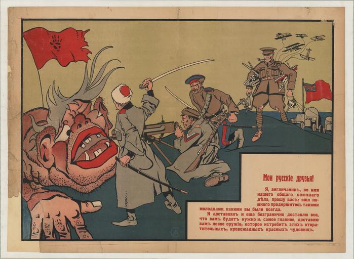 Keywords: 32 Sammlung Eybl Russland. Anonym. Мои русские друзья. (Meine russischen Freunde). 1919. 68 x 86 cm. (Slg.Nr. 1693).jpg de Russland Anonym ои усские д узья Meine russischen Freunde 1919 68 x 86 cm Slg Nr 1693 Der Brite verspricht seinen russischen Freunden weiter gegen diese rote Bestie zu helfen und sie mit Waffen zu unterstützen Zu sehen sind am Bild ein Kosak der Weißen ein tschechischer Legionär am Maschinengewehr sowie zwei britische Soldaten die von ihren Schiffen Rüstungsgüter heranschaffen Trotz der westlichen Unterstützung unterlag die zerstrittene eitle und egoistische russische Opposition im Bürgerkrieg der Roten Armee Trotzkis und Lenins Sammlung Eybl Plakatmuseum Wien 2009-07-30 16 02 44 A Erhardt Credit line Eybl Plakatmuseum Wien/Wikimedia Commons CC-BY-SA-4 0 wiki Sammlung Eybl Plakatmuseum Wien PD-old World War I posters of Russia Plakatmuseum Wien Eybl Collection 32 Sammlung Eybl Russland. Anonym. Мои русские друзья. (Meine russischen Freunde). 1917. 68 x 86 cm. (Slg.Nr. 1693).jpg de Russland Anonym ои усские д узья Meine russischen Freunde 1917 68 x 86 cm Slg Nr 1693 Der Brite verspricht seinen russischen Freunden weiter gegen diese rote Bestie zu helfen und sie mit Waffen zu unterstützen Zu sehen sind am Bild ein Kosak der Weißen ein tschechischer Legionär am Maschinengewehr sowie zwei britische Soldaten die von ihren Schiffen Rüstungsgüter heranschaffen Trotz der westlichen Unterstützung unterlag die zerstrittene eitle und egoistische russische Opposition im Bürgerkrieg der Roten Armee Trotzkis und Lenins en Russia Anonymous ои усские д узья My Russian friends 1917 68 x 86 cm Slg Nr 1693 The Briton promises his Russian Friends against this red beast to help and to assist them with weapons You can see the image of a Cossack whites a Czech legionnaire at the machine gun and two British soldiers who bring along from their ships armaments Despite the western support the fractious vain and selfish Russian opposition was defeated in the civil war of the Red Army of Trotsky and Lenin Sammlung Eybl Plakatmuseum Wien 2009-07-30 16 02 44 A Erhardt Credit line Eybl Plakatmuseum Wien/Wikimedia Commons CC-BY-SA-4 0 wiki Sammlung Eybl Plakatmuseum Wien PD-old February Revolution Russia Plakatmuseum Wien Eybl Collection Quality images by Hubertl Quality images by Hubertl 2016 Lubok QualityImage